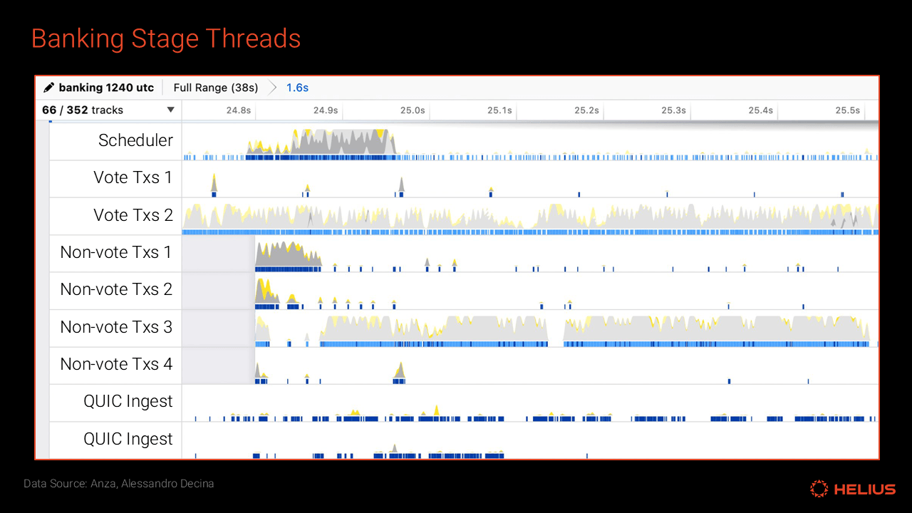 QUIC 摄取线程:当验证者为领导者时,Tokio 线程通过 QUIC 协议管理交易摄取。在 2024 年初的拥堵期间,这些线程是一个重大瓶颈。