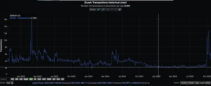 Zcash 的日交易量其实很低(每天 5–10k 笔),但它当前的「隐私」叙事非常强,因此获得了大量关注。而这种关注也可能反过来推动其可用性(参考近期交易量激增)。